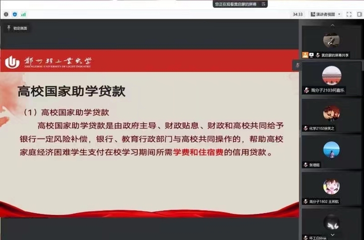 为进一步做好资助育人工作,加强学生诚信教育。6月13日,材料与化学工程学院利用腾讯会议平台开展了2022年国家助学贷款政策宣讲暨诚信教育大会。学院家庭困难学生参加了本次会议,会议由资助工作负责人黄启蒙主持。