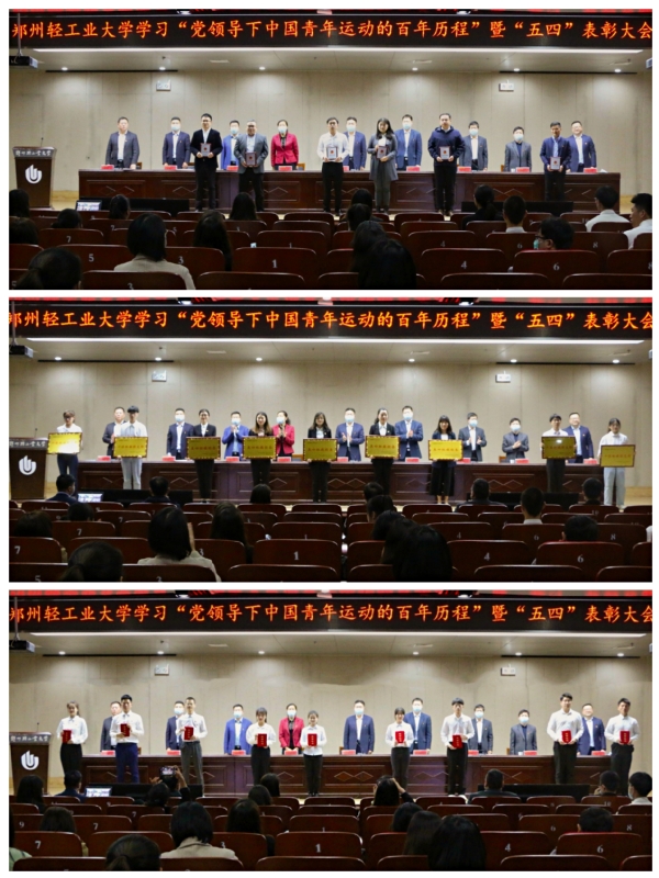 下午3点,大会在嘹亮的国歌声中隆重开幕。首先,党委学工部负责同志宣读《关于表彰郑州轻工业大学2021年度共青团系统先进集体和优秀个人的决定》,与会领导为“青年五四奖章”“五四红旗团委”“十佳团支部”“十佳共青团干部”和“十佳共青团员”代表颁奖。随后,获奖代表作经验分享,发出“生逢盛世,肩负重任,请党放心,强国有我”的青春誓言,表达了轻大青年不负青春韶华、勇担历史使命的信心和决心。