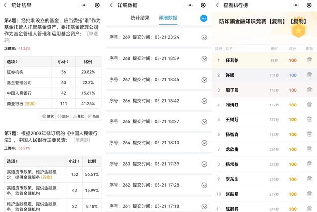 本次比赛面向全校学生,以“无诈校园,商行天下”为特别主题,结合疫情防控要求,通过线上答题进行,共有340人参加。自活动宣传开始,同学们踊跃报名参加比赛,极大的调动了全校学生的积极性,选手们提前查询资料,增强大家对金融防诈骗知识的了解。通过线上答题的形式,对诈骗的相关基础知识进行考察,并在具体情境下让同学们进行选择,在答题的过程中,同学们对诈骗有了进一步的认识。通过得分和答题时间综合排名,共有100名同学获奖,其中,一等奖13人、二等奖25人、三等奖62人。