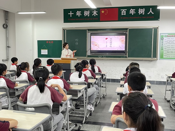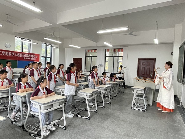 7月2日,家乡所在地为景德镇的李姗妮同学,穿上中华传统服饰前往当地的百树学校进行吟诵教学。李姗妮同学向孩子们介绍了身上穿的汉服,并告诉他们:汉服是中国传统的服饰,同时也是华夏文明上下五千年悠长历史的缩影。虽然在现代社会中,人们已经不把它作为日常服饰来穿戴,但它对中华民族来说却十分重要,是一件美丽的瑰宝,为了更好地传承它,把它放在博物馆里是远远不够的,更需要将它融入日常生活中,同样的,还有吟诵这样优秀的非物质文化遗产。这样的话语不仅为孩子们讲述了传承中华优秀传统文化的重要性,同时还引入了这堂别开生面的国学课。