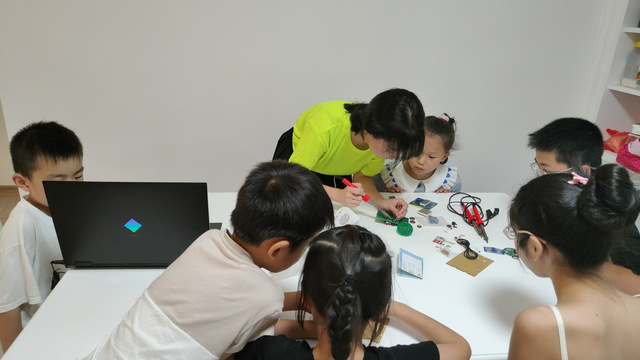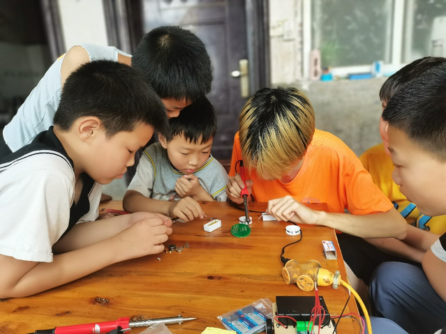 小分队成员马良和吴雨璐在各自社区带领孩子们动手实践,边做边讲,在确保安全的前提下指导小朋友们把一个个小小的电子元器件焊接在电路板上。通过共同的努力,电子陀螺炫酷的LED灯光亮起,音箱随节奏播放动听的旋律,新奇的体验激发了孩子们对科技创新的兴趣,也将探索科学的种子种在了孩子们心中。