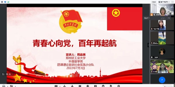 为进一步学习贯彻习近平总书记在庆祝中国共产主义青年团成立100周年大会上的重要讲话精神,引导广大青年学生上好与理论结合的“大思政课”,坚定信念听党话、跟党走,迎接党的二十大胜利召开,郑州轻工业大学外国语学院团课理论宣讲小分队于7月1日至15日,以接力棒的形式在河南、福建、东北等地通过线上线下相结合的方式与当地青少年团员共同上了一节以“青春心向党,百年再启航”为主题的团课,带领青少年团员们重温入团誓词,不忘初心使命。