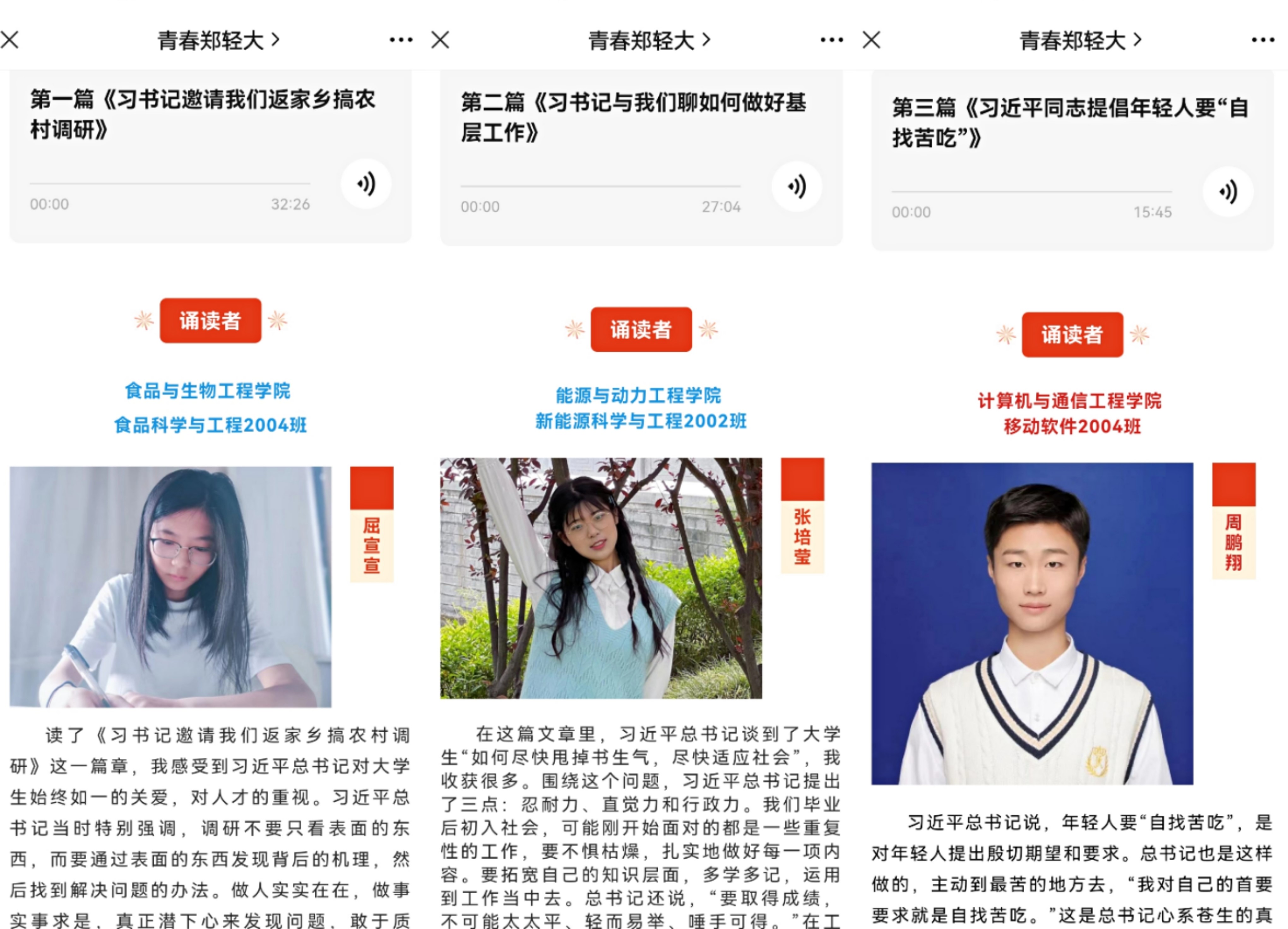 活动前期,学校第26期“青马工程”培养班团支书张培莹根据《习近平与大学生朋友们》一书中的文章内容进行角色分配,带领同学们提前熟知篇章内容,以便在诵读过程中更贴近角色。为保证活动的顺利高效进行,团队开展了音视频剪辑、微信推文制作等专题培训。活动中,团队成员通过开展学习分享会、领读人活动等方式,分别就不同的章节选段,阅读采访实录与生动故事,并结合亲身经历,从人生理想、社会实践、志愿服务、疫情防控等方面谈感受,分享读书体会,共同领悟总书记对青年的期盼和要求,感悟党的精神谱系,传承红色基因,当好新时代答卷人。