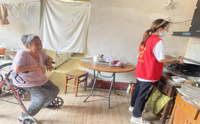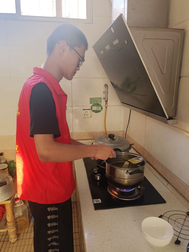 沧州市肃宁县的实践队员孙懋喆同学拜访社区的独居老人。在探访时,孙懋喆同学携带了牛奶和水果为奶奶补充营养,也为老人做饭炒菜,聆听着奶奶年轻时代的人生经历,感叹着当今幸福生活的来之不易。饭后,实践队员帮助老人清洗并晾晒衣物。临走前奶奶将自家种植的李子赠送给孙懋喆同学,并期待实践队员的下次到来,孙懋喆表示以后会定期看望她。实践队员的到来,让老人有倾诉心声的对象。关注老人身心健康,把对老年人的关爱延续下去,让他们颐养天年是我们新时代青年义不容辞的责任。