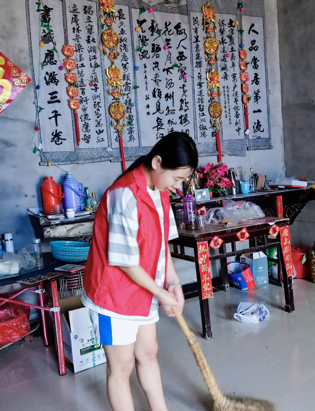 诸暨市的实践队员王逸夫同学来到家附近社区老人家中。实践队员与老人交谈过程中,了解到老人独居在家,仅有一只相伴三年的小狗。为帮助奶奶减轻家务负担,实践队员积极帮忙打扫卫生,整理屋子,老人很是感动。实践队员表示,爱老敬老是社会的责任,也是每一位青少年的责任,老年人在青年时期曾为了祖国建设、社会的发展贡献自己的每一份力量,作为青年学生要关心爱护他们,让他们安享晚年。