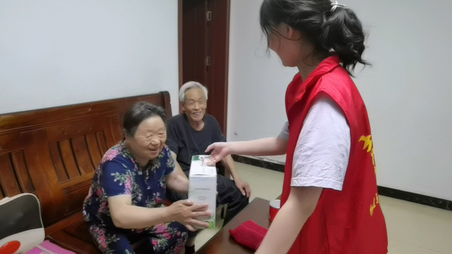 阜阳市太和县的实践队员任元元同学探望社区的孤寡老人。在老人家中,实践队员送上水果和牛奶等慰问品,跟老人聊天,询问老人的日常生活,为老人打扫卫生、整理家务,让老人家减少操劳。中午实践队员亲手为老人做了丰盛美味的午饭。随后,实践队员告诉老人如何使用智能手机。实践队员说敬老爱老是每一位新时代青年该做的事情,一个温暖的拥抱,一句亲切的问候,都能让老人感到幸福和快乐,自己也在跟老人的交流中学习到很多生活的智慧。