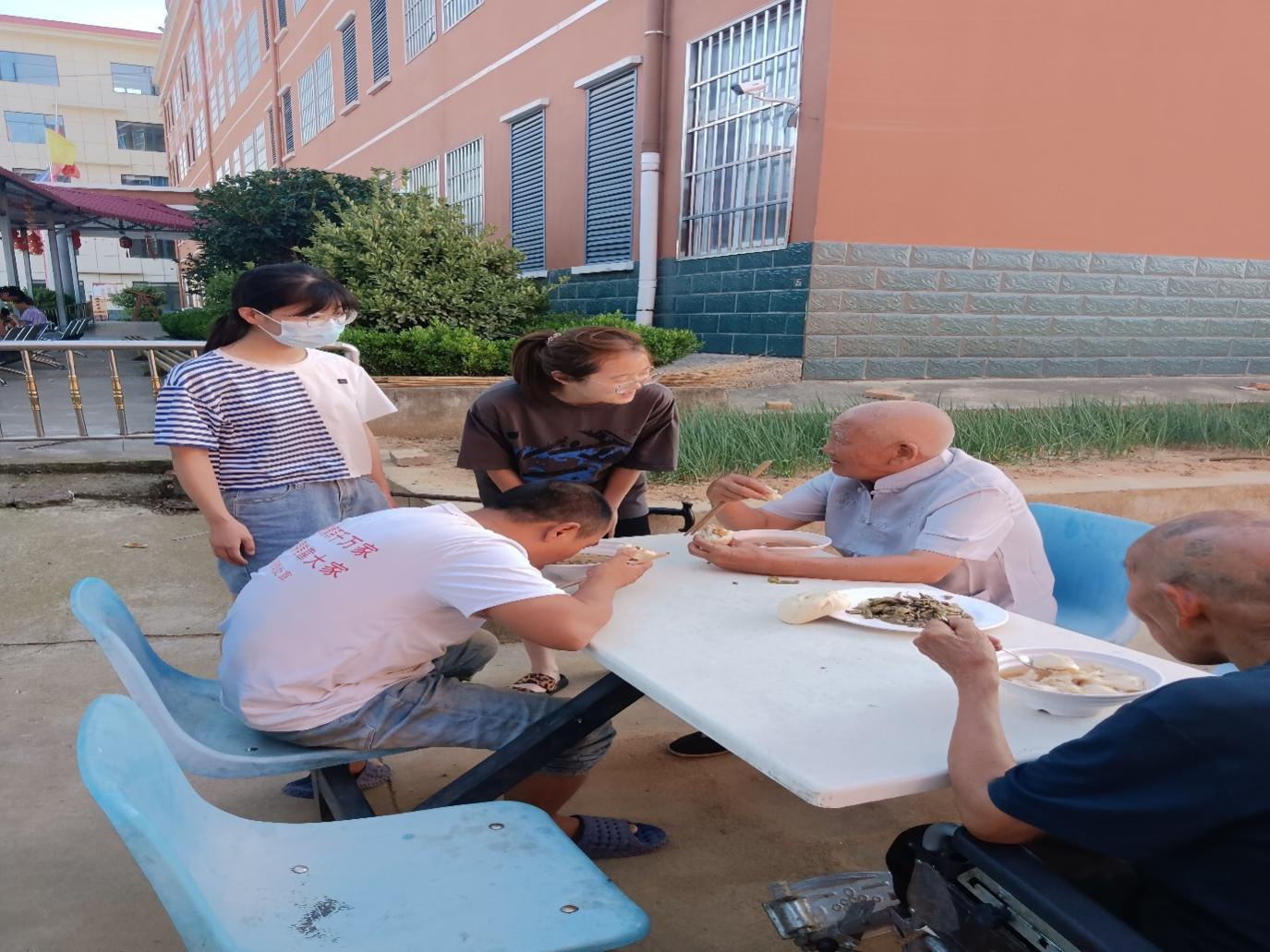 7月15日下午,实践队员们来到了南阳市淅川县寺湾镇康德老年公寓。一来到老年公寓,实践队员们没有来得及停歇,就帮助老人们整理内务,打扫老人房间卫生、整理床铺,打扫出干净舒适的生活环境。劳动之后,队员们来到老人身边,围坐在老人身边促膝长谈,倾听老人心声,听老人讲他们过去的故事。在与老人进行深入交谈中,队员们了解到了老人的生活现状、身体状况和精神状态等,并根据老人实际需求进行下一步准备,给予帮助与支持。在就餐期间,实践队员们为老人们端饭、夹菜,与老人相处的非常融洽,气氛十分温馨。队员们的热情和老人的笑声充满了整个院落,到处洋溢着温馨、祥和的气氛。活动后,队员们叮嘱爷爷奶奶们要保重身体,今后会经常过来看望他们。老人们激励队员们要好好学习,奋发图强,做一个对国家对社会有用的人。