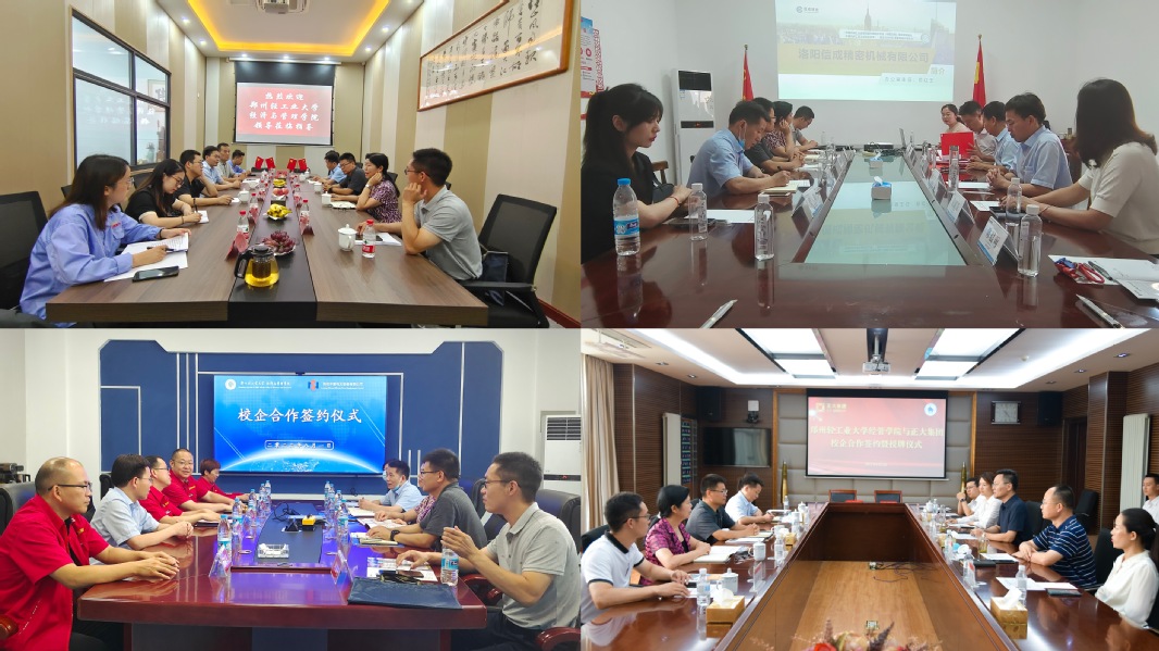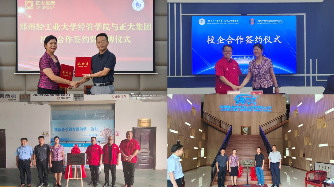 座谈会后,学院与洛阳凯宾耐特钢柜有限公司、洛阳申耐电力设备有限公司、洛阳古都科创园运营有限公司、洛阳信诚精密机械有限公司、洛阳正大食品有限公司等企业签订了校企合作协议,并举行了郑州轻工业大学经济与管理学院就业实习基地揭牌仪式。