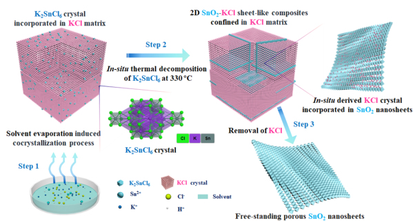 二维多孔金属氧化物纳米片(2DMONs)具有高的表面体积比、周期性的长程旋转和平移对称原子结构,在能源存储、催化、电子器件和化学传感器等领域的各种应用中引起了广泛的研究兴趣。然而,现有的 2DMONs合成方法过程复杂苛刻,效率低,不力于实际应用,因此,开发一种通用、高效、经济的晶态2DMONs的合成方法具有重要意义。针对此问题,该团队开发出一种共结晶诱导空间自限域方法合成多孔金属氧化物纳米片,以盐颗粒(如KCl和KBr)为模板合成晶态多孔金属氧化物纳米片,包括SnO2, Fe2O3, NiO, Co3O4, CuO, ZnO, In2O3, CeO2和二元金属氧化物CeO2/SnO2, Co3O4/Fe2O3;并将其应用于气体传感器领域中。制备的晶态2D多孔CeO2/SnO2纳米片作为气体传感器对3-羟基-2-丁酮表现出了优越的传感性能(3-羟基-2-丁酮是检测单核细胞增生李斯特菌的生物标志物)。