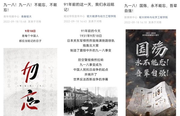 上午10时00分至10时31分,河南省防空警报统一鸣响,全省人民为在抗战中牺牲的革命烈士和罹难同胞默哀。各校级学生组织在线上举行了纪念“九一八事变”默哀仪式,警报响起,全体青年学生庄严肃立,默哀三分钟,向在那段屈辱、悲壮的历史中献出宝贵生命的群众和烈士致敬。