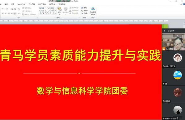 为引导青年学生进一步坚定理想信念,全面提升大学生骨干的综合素质,数学与信息科学学院和机电工程学院团委积极响应校团委的号召,于9月24日上午在线上以腾讯会议的形式召开了院级青马学员素质能力提升与实践第五组开班仪式。本次启动仪式由数学学院团委书记张智勤主持,全体青马学员参加此次开班仪式。