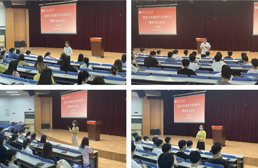 会上,蔡晨阳老师传达了三实书院宿舍文化建设月活动方案,分别从思想引领、学风建设、文艺熏陶、创新创业、文化体育、宿舍卫生六个方面对宿舍文化建设月活动进行了解读。石庆福老师重点介绍了“书院杯”系列体育活动开展方案。陈思萌老师重点介绍了书院文化艺术品牌活动和心理健康教育活动开展方案。刘放美老师向宿舍长梳理了学生宿舍组成、宿舍长职责,介绍了宿舍文化建设的各项举措,强调了本次宿舍文化建设月活动不仅仅是宿舍文化卫生环境建设,更重要的是营造一种团结、向上的宿舍氛围与讲文明、树新风的理念,达到宿舍环境文化育人的目标。会议最后,三实书院全体老师一起宣布宿舍文化建设月正式启动。