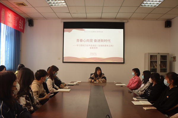 矫菲老师带领与会人员认真学习了《论党的青年工作》文集。《在庆祝中国共产主义青年团成立100周年大会上的讲话》一文,强调了“党管青年”的原则,明确了青年工作的政治属性和育人目标;《在纪念五四运动一百周年大会上的讲话》中,鲜明地提出了中国青年运动的时代主题,明确了当代青年新的使命;在《新时代青年要爱国、励志、求真、力行》中,明确了青年要立心立志的时代要求;在《广大青年成长成才要励志勤学、加强磨炼》中,要求青年要肩负远大理想,锻炼过硬本领,励志肩负起民族复兴的历史重任。矫菲老师号召广大青年学生,要牢记总书记的嘱托,坚持青春向党、志存高远,把个人追求和时代发展结合起来,为民族复兴事业奋斗终生;坚持不懈学习、锻炼本领,提高自身综合素养,把论文写在祖国的大地上;坚持敢于担当、无私奉献,主动投身于社会实践和志愿服务工作中,用所学服务社会和人民。