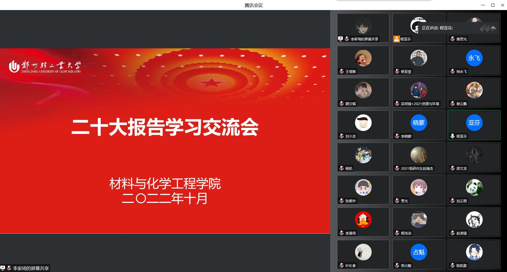 10月16日-10月22日,党的二十大在北京隆重举行。22日,材料与化学工程学院学生党支部举行学习二十大报告讨论交流会,会议由学院组织员程亚芬主持,学院党委副书记司丽娜、各学生支部书记、学生党员和入党积极分子代表参会。