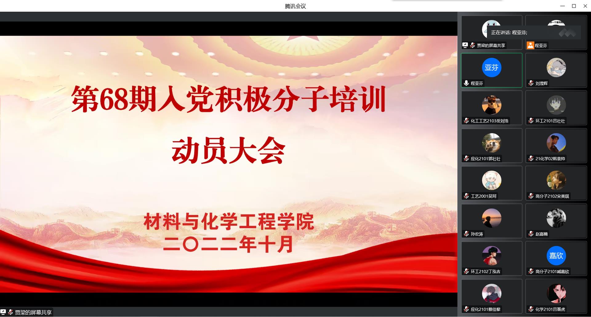 为深入学习贯彻党的二十大会议精神,做好入党积极分子的培养教育工作,提高入党积极分子的思想政治素质,严把入党“第一关”,10月28日,材料与化学工程学院举行第68期入党积极分子培训动员大会,学院党委副书记司丽娜、组织员程亚芬和第68期入党积极分子培训班全体学员参加此次会议。