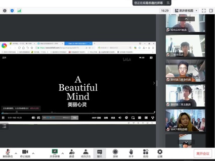 观影前,新生辅导员郝鑫老师介绍了当前郑州疫情防控形势、学校疫情防控相关政策以及校园平安背后舍小家为大家逆行者的感人故事。活动中,辅导员带领大家观看“五四特别版“错位时空””短片,引导广大同学珍惜当今的幸福来之不易,它是无数革命前辈拼出来、干出来的,战“疫”成功,需要 “疫”起加油,为心赋能。随后,师生共同观看《美丽心灵》。同学们将自身带入剧情,感受纳什曲折却完整的人生,学习纳什锲而不舍的精神与顽强不屈的意志,与纳什完成了一场心灵上的邂逅。大家纷纷发表观后感,表示通过观看这部影片感受颇深,要学会观察倾听,学会理解尊重,用爱心耐心细心去帮助他人。