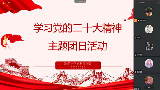 活动中,数学与信息科学学院组织各团支部通过多种形式收听收看党的二十大开幕现场直播,并深入学习党的二十大精神。20级各团支部开展起“党的二十大知识问答竞赛”系列活动,21级各团支部掀起“学报告 悟精神 谈感想”系列团日活动等。学院学生宋颖说:“青春献礼二十大,强国有我新征程!党的十八大以来,党和国家事业取得历史性成就、发生历史性变革,最根本的原因在于有习近平总书记作为党中央的核心、全党的核心掌舵领航,在于有习近平新时代中国特色社会主义思想科学指引。现阶段我们作为青年学生,更应该深入学习习近平新时代中国特色社会主义思想,以梦为马,不断探索,用不畏艰苦的奋斗、崇尚实干的担当和开拓进取的创新继承、奔赴伟大梦想,再现时代华章。”