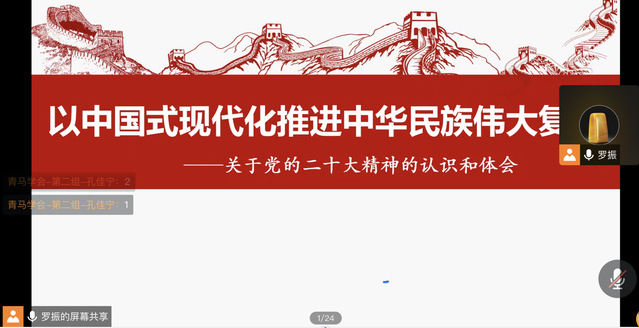 为进一步学习领悟党的二十大报告的新观点、新论断、新战略,深入了解掌握党的二十大报告中的思想内涵和精神要义,结合“学习二十大、永远跟党走、奋进新征程”主题活动,11月10日下午,校团委组织青年讲师团成员、马克思主义学院罗振博士走进青马班和青马社团,通过线上会议的形式宣讲党的二十大精神,分享学习心得体悟,进一步坚定青年学生听党话、跟党走的信心和决心。