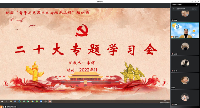 专题学习会在线上进行,校青马讲师团成员李辉老师首先强调青马学员一定要将学习宣传贯彻党的二十大精神作为当前和今后一个时期内的首要政治任务,并布置了下一阶段的学习安排。接着,李辉老师带领着学员一起研读党的二十大报告、同学代表诵读党的二十大报告部分精彩段落,紧接着,学员们展开讨论,汇报学习成果,分享心得体会。学员何一帆说,作为一名软件学院的青年学生,我将努力学习专业知识,用编程、代码的力量在信息、网络、数据等方面为建设“数字中国”贡献力量;同时,以全心全意为人民服务作为信条,不断提升工作能力,让和谐积极的校园之风洋溢在同学之间,以奋斗的青春谱写新时代华章。建筑环境工程学院李广源说,作为一名中共预备党员,将永远感党恩、听党话、跟党走,全心全意为人民服务,积极发挥好学生骨干的模范带头作用,更加努力学习专业知识技能,积极投身到党和人民事业中去,让青春在全面建设社会主义现代化国家的火热实践中绽放绚丽之花。通过讨论学习,学员们纷纷表示要加强政治理论素养,用党的科学理论武装头脑。