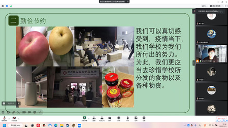 活动中,团支书带领同学们学习了习近平总书记关于制止餐饮浪费行为的重要指示精神,分享了我国粮食生产取得连年丰收走过的不平凡道路,学习了解了习近平总书记勤俭节约的事迹。团支书带领班级同学共同观看勤俭节约的视频资料,探讨绿色发展理念,号召大家将勤俭节约精神于生活小事中体现,珍惜每一餐饭,节约每一粒粮,实施“光盘打卡行动”,杜绝舌尖上的浪费,“自然光线充足时不开灯,杜绝‘白昼灯’、‘长明灯'”,“离开宿舍时做到人走电断”。在讨论环节,同学们畅所欲言,分享自己在生活中遇见的“文明轻大”故事。大家纷纷表示,要从小事做起,厉行节约、反对铺张浪费。