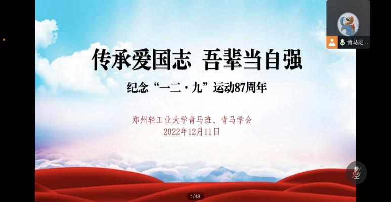 为纪念一二·九学生爱国运动87周年,学习党的二十大精神,厚植同学们的家国情怀,增强振兴中华的责任感,12月11日19:00,我校青马班、青马学会通过腾讯会议开展了“传承爱国志,吾辈当自强”纪念“一二·九”运动87周年主题团日活动,活动由学校第26期“青马班”班长常时福主持。青马班指导老师范丹莹、第26期“青马班”学员、青马学会会员参加了本次活动。
