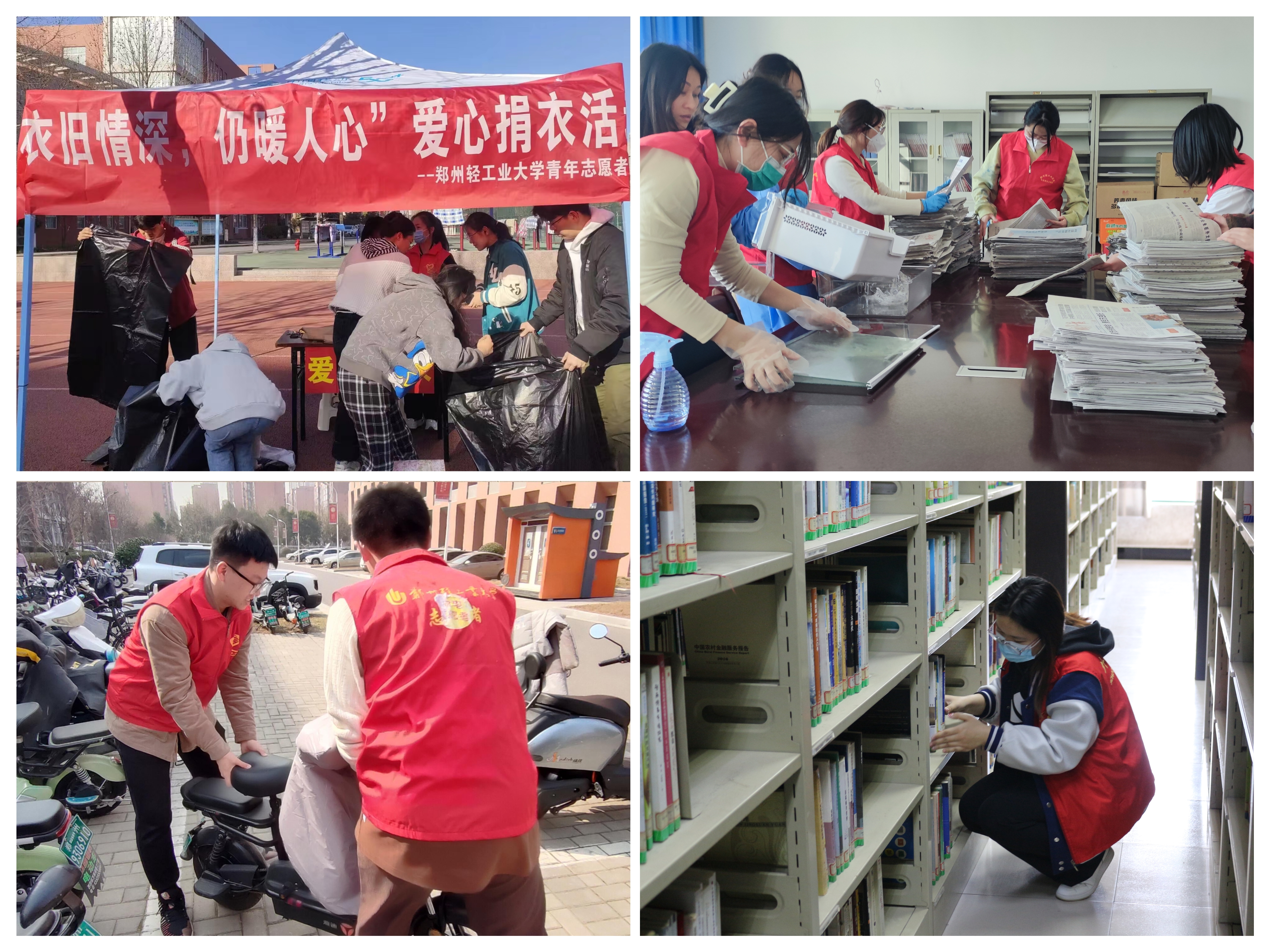 为积极倡导“奉献、友爱、互助、进步”的志愿服务精神,电气信息工程学院、机电工程学院、马克思主义学院、外国语学院、物理与电子工程学院、能源与动力工程学院组织学生志愿者,分别在实验室、图书馆、体育馆和校园内开展卫生清扫和环境美化志愿服务;材料与化学工程学院、青年志愿者协会在两校区开展了“衣旧情深,仍暖人心”爱心捐衣活动,用亲身实践传承雷锋精神,让学雷锋、树新风、做先锋蔚然成风。