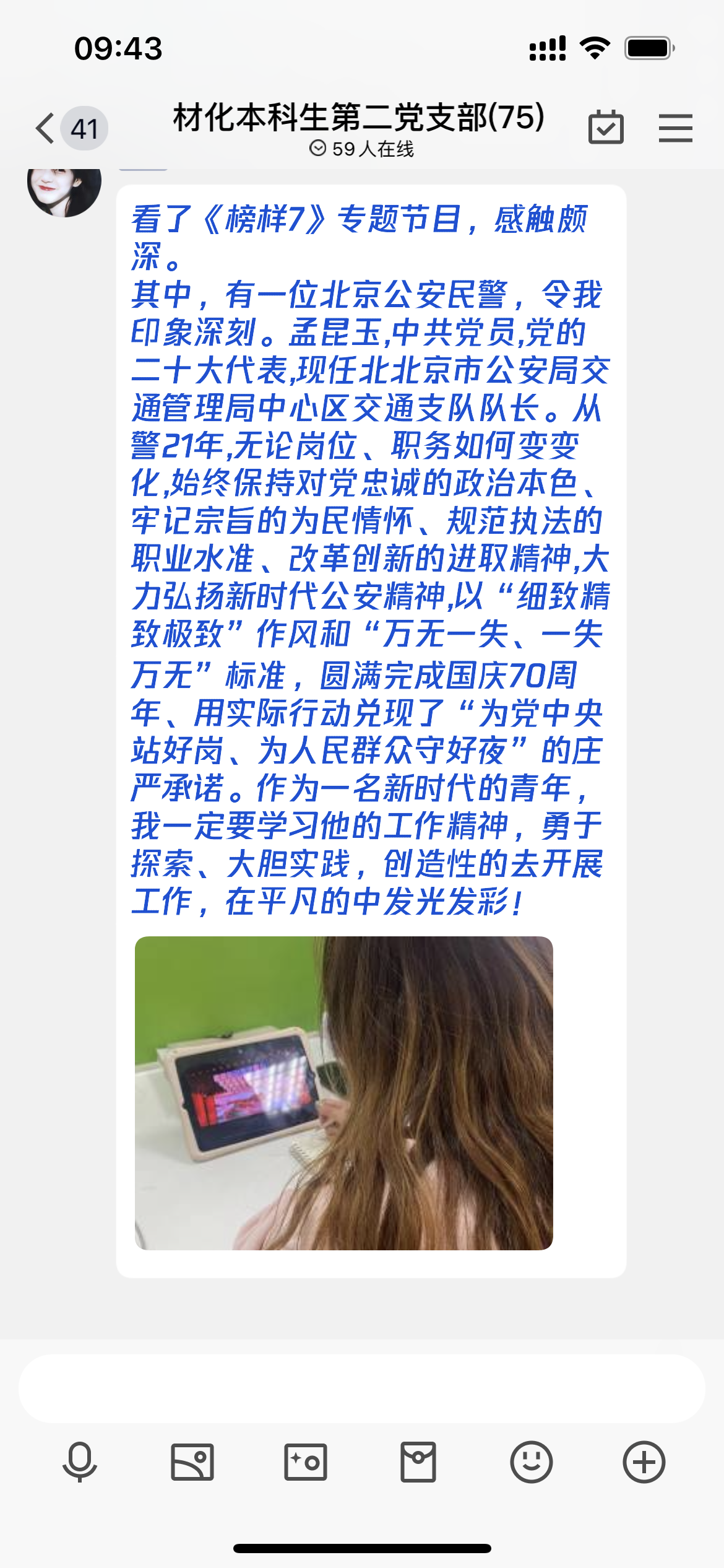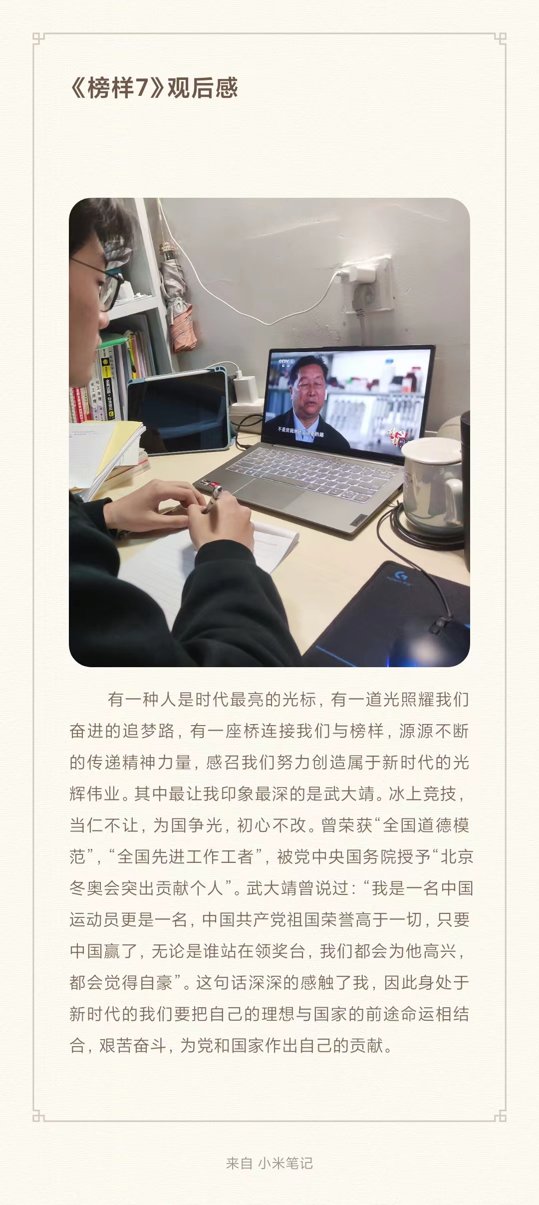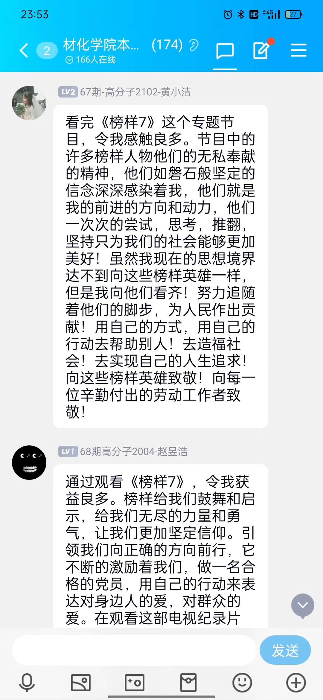 《榜样7》专题节目邀请王亚平、王传喜、艾爱国、张玉滚、武大靖、林占熺、孟昆玉、路生梅等8位党的二十大代表,通过典型事迹展示、现场访谈、重温入党誓词等形式,生动展现中国共产党人坚定信念、践行宗旨、拼搏奉献、廉洁奉公的高尚品质和精神风范,彰显基层党组织战斗堡垒作用和党员先锋模范作用。观看结束后,同学们在党建群里互相交流观后感,大家纷纷表示,在今后的工作和生活中,要向榜样学习,用心、用情、用行动做好本职工作,不负时代使命,争做优秀的共产党员。