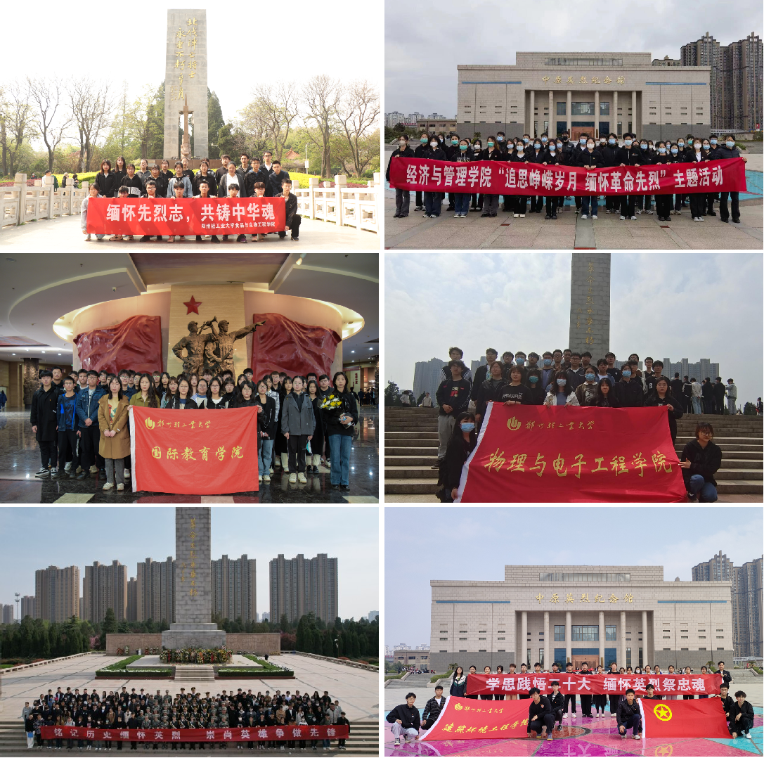 经济与管理学院、国际教育学院、物理与电子工程学院、体育学院、建筑环境工程学院、校青马班、青马社团组织团员代表赴郑州市烈士陵园及中原英烈纪念馆开展祭奠英烈活动,学习中原烈士们的革命故事和抗战精神;食品与生物工程学院、能源与动力工程学院组织学生代表前往碧沙岗纪念革命英烈;电气信息工程学院学生参观了二七纪念馆,学习了革命前辈身上不怕苦不怕累,全心全意为人民服务的精神。