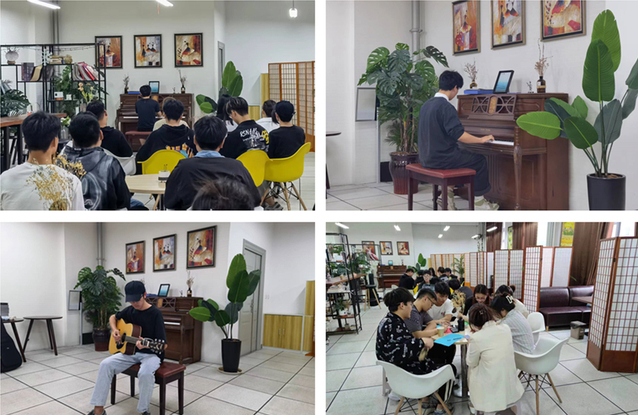 活动在书院同学的钢琴演奏、笛声奏响、吉他弹唱等才艺展示下拉开了帷幕。一首肖邦的钢琴旋律,如行云流水般倾泻,让大家沉醉其中;更有陈思萌老师的笛声与学生的钢琴合奏,传递着春天鸟语花香、阳光明媚的美好世界;流行音乐的吉他弹唱,也让大家跟随音乐一起哼唱,引得现场掌声连连,氛围高昂。活动第二环节是“青春畅谈”,同学们写下自己对之后大学生活的期许、对未来生活的描绘、对自己想说的话,分享内心的乐事,诉说心中的不快,记录有意义的瞬间,为未来送上美好祝福。每个同学的贺卡表露着真情,字字句句传递着真意。活动第三环节叫做“鼓圈音乐”,同学们在活动场地上聚坐一圈,在手铃、非洲鼓中挑选自己喜欢的乐器,跟随引领者学习着拍打音乐的节奏,共同练习,合奏出了一首优美的乐章,现场氛围高涨,笑声起伏不断。最后环节是“DIY乐器制作”,同学们通过现场中的现有材料,创造出可以发声且美观的“乐器”,深受同学喜爱。