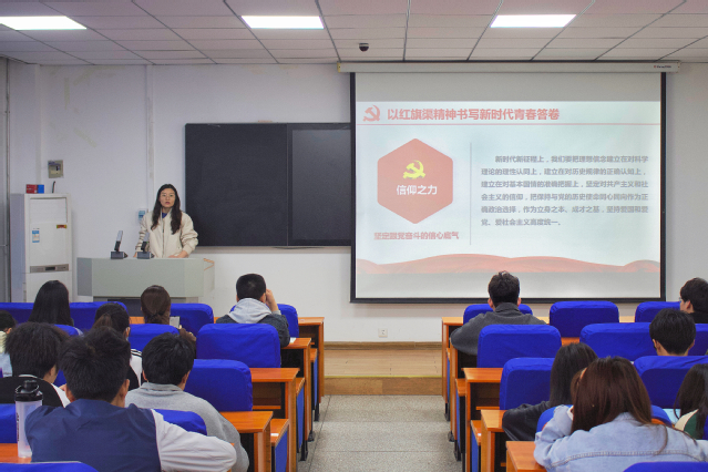李燕老师以“以红旗渠精神书写新时代青春答卷”为题,带领同学们详细了解红旗渠修建的历史背景及意义,深刻感悟红旗渠精神的丰富内涵,深入探寻弘扬红旗渠精神的基因密码,并围绕当前党和国家发展面临的新形势和新任务,结合青年学生思想学习实际,就如何发扬红旗渠精神,展现新时代青年责任担当进行详细阐述。李老师指出,红旗渠精神是我们党宝贵的精神财富,也是我们在新时代新征程上战胜困难、赢得未来的精神力量。希望广大学生从红旗渠精神中汲取“信仰之力”,坚定跟党奋斗的信心底气;汲取“斗争之力”,砥砺英勇奋斗的过硬担当;汲取“创造之力”,争当开拓创新的时代先锋;汲取“为民之力”,永葆无私奋斗的高尚品格,自觉担负起实现中华民族伟大复兴的历史重任,为祖国、为社会贡献自己的全部力量。