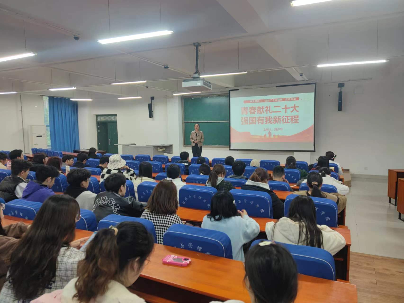 本次宣讲以“青年献礼二十大,强国有我新征程”为主题,姚少华老师重点围绕大会主题、主要成果、从深刻把握过去5年工作和新时代10年伟大变革的重大意义、青年的发展事关国家未来、做新时代的有为青年等方面进行了讲解。青年的发展事关国家未来,青年兴则国家兴,青年强则国家强。青年一代有理想、有本领、有担当,国家就有前途,民族就有希望。随后姚老师向同学们提出了做新时代有为青年的具体要求,激励大家勤奋踏实,好好学习,拼搏奋斗;引导同学们树立远大志向,以国家为己任,坚守砥砺实干奋进之心,为社会发展做贡献,为人民生活谋幸福。作为新时代的青年要深刻领悟“两个确立”的决定性意义,坚决做到“两个维护”,坚定不移听党话跟党走,怀抱梦想又脚踏实地,端正价值追求,努力提升个人专业素质和理论水平。青春幸逢盛世,成长正当其时,作为新时代的青年,要主动担当使命,不怕吃苦,踏实肯干,为中华民族伟大复兴奋力拼搏、勇往直前。