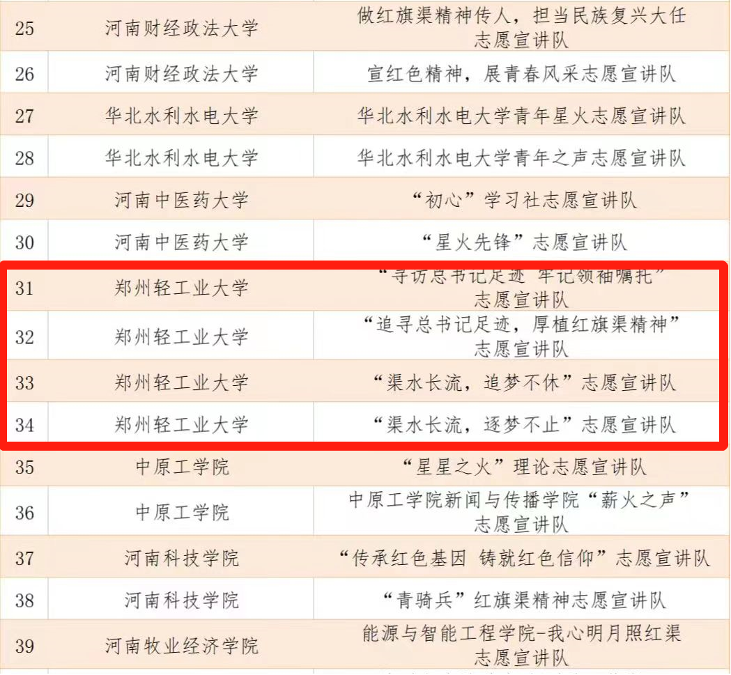 为深入学习宣传贯彻党的二十大精神和习近平总书记视察陕西延安、河南安阳重要讲话精神,发挥共青团组织优势,动员大学生学习、传承、弘扬红旗渠精神,教育引导广大青年为全面建设社会主义现代化国家贡献青春力量,省委宣传部、团省委开展了河南省大学生“红旗渠精神代代传”志愿宣讲活动。近日,河南省大学生“红旗渠精神代代传”志愿宣讲队入选名单公布,全省共200支大学生志愿宣讲队入围,我校四支团队获批,获批数量位列全省高校并列第一。
