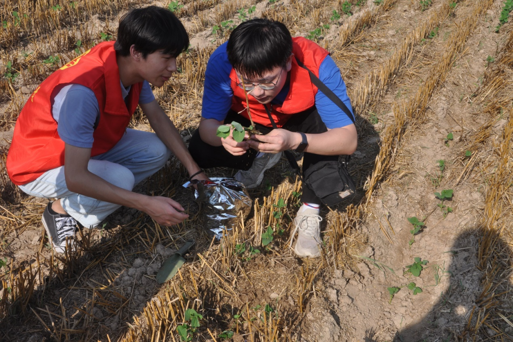 “我们清东村的土壤有什么特点?乡亲们种植大豆对清东村有什么经济价值?”食品工程“强农兴农团队”指导老师及团队成员在驻村第一书记赵志明的带领下来到村部会议室,从农业生产中农户最关心的化肥过量使用与生物固氮的差异点入手,为大豆种植农户介绍生物固氮的知识以及接种大豆根瘤菌剂的必要性。实践团队从国家政策入手,向农户介绍了大豆种植未来的广大发展前景。讲解结束后,团队与农户一起来到了田间地头,与农户就大豆种植的过程管理进行了深入沟通和交流,并对土壤取样,观察大豆苗的根部结瘤情况。