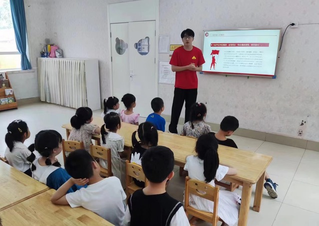 为传承红色基因,培养少年儿童爱党爱国情怀,7月5日,志愿者们来到郑东新区金色年华幼儿园开展井冈山精神宣讲,活动以“小切口”展现“大主题”,以“小故事”讲述“大道理”形式进行,志愿者孔佳宁向孩子们讲述了《朱德的扁担》和《毛主席送棉衣》的红色小故事。朱德扁担上的八个字“朱德扁担不准乱拿”给孩子们留下了深刻印象,在《毛主席送棉衣》故事中,寒冬积极缺乏保暖物资,讲到毛主席把自己唯一的棉衣送给了群众时,孩子们深受感动,志愿者们告诉孩子们,在革命时期有众多向毛主席和朱德同志这样的中国共产党人,他们与人民群众共进退、共患难、勇当表率,鼓励小朋友们学习英模前辈无私奉献、热爱祖国的精神品质,学习文化知识,成为对国家和社会有用的栋梁。随后,在志愿者的引导下,孩子们参与了知识竞答,活动中孩子们踊跃参与,主动与志愿者互动,积极回答问题,表现出对红色故事的极大兴趣,现场气氛十分热烈。
