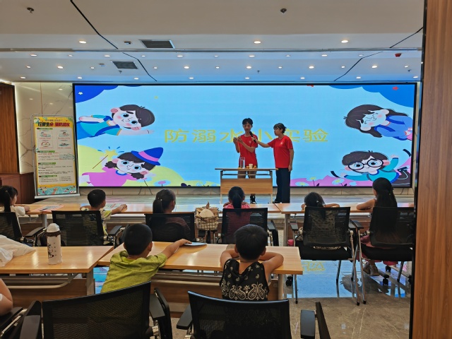 室外宣讲结束后,室内安全讲座如火如荼地进行。志愿者使用鸡蛋、石头和水瓶等模拟了溺水的情景,在生动形象的实验中,小朋友们情绪高涨,积极地回答志愿者们提出的问题,在轻松愉悦的氛围中将安全知识铭记于心。为了让小朋友们知道同伴溺水该如何救助,三位志愿者演绎溺水救助情景剧,向小朋友们讲解私自下水救人的危险性;活泼有趣的防溺水手势舞使小朋友们的情绪空前高涨,与志愿者共同高唱安全保护歌。之后志愿者带领孩子们学习了“四牢记六不准”,安全知识谨记心间。