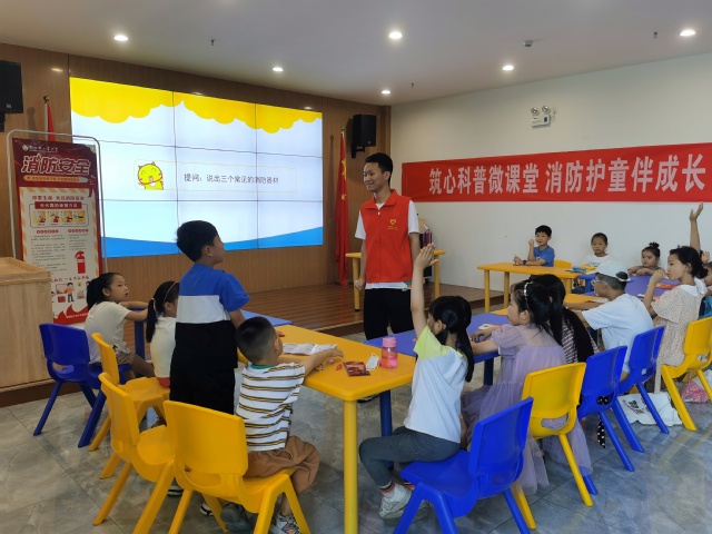 “拿一个湿毛巾,沾湿之后,匍匐前进,不要坐电梯,走安全出口!”“拨打火警电话要讲清楚自己的地址!”伴随着小朋友们响亮的抢答声,志愿者在秋雅社区党群服务中心为社区儿童带来了一场别开生面的消防科普知识讲座。活动中,志愿者巧妙地用拟声词教小朋友们区分了消防车、急救车、警车的不同声音,并通过一张张生动的图片带大家认识了生活中的消防器材、消防标识和常见的易燃品。为了提高儿童的消防安全意识和火灾自救能力,志愿者为小朋友们演示了灭火器的使用方法,并通过生动形象的肢体表演讲解了火灾逃生的基本知识。“先拿湿巾捂口鼻,快快趴下向前移。记住别回火场里,生命安全为第一……”伴随着小朋友们整齐的诵读声,消防安全知识讲座圆满结束。