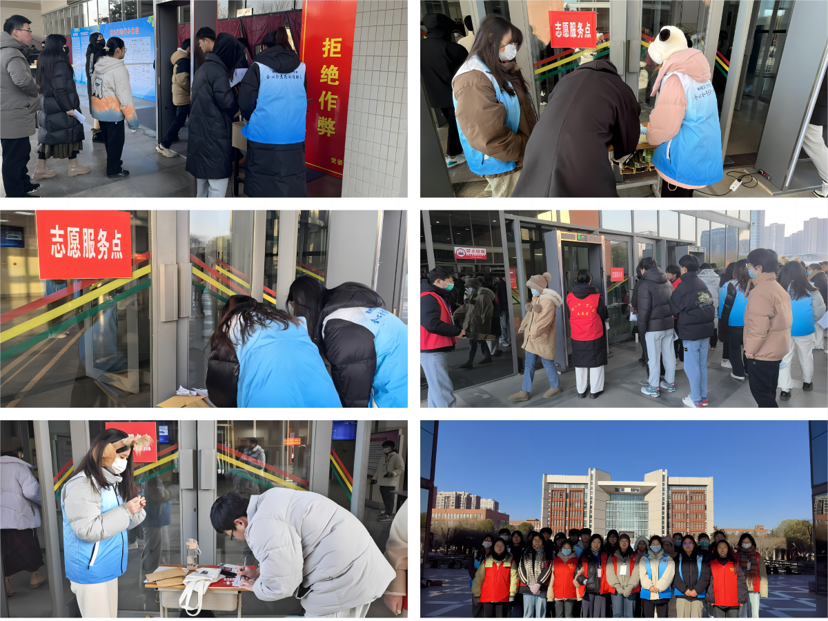 为保障2023年全国硕士研究生招生统一考试正常进行,做好考试期间的后勤服务工作,12月23日至24日,我校学生会和青年志愿者协会组织100余名志愿者在两校区各教学楼考点开展全国硕士研究生招生统一考试志愿服务活动,在入场引导、物品保管等方面为考生提供了全面周到、细致入微的志愿服务。
