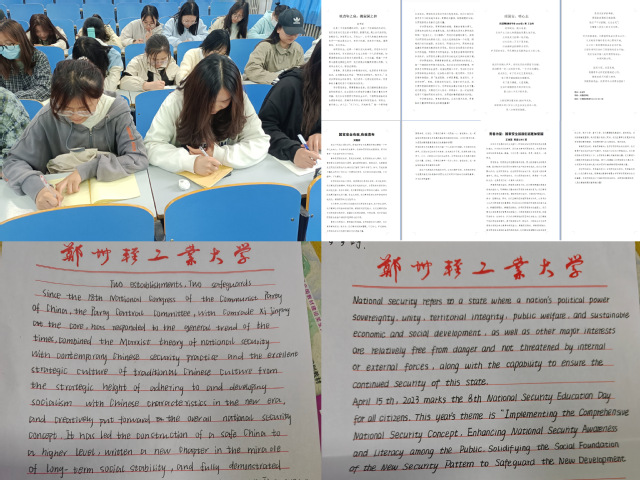 此次活动包涵主题宣讲、征文、中英文双语硬笔书法比赛等多种形式。活动中,各团支部分别围绕习近平总书记关于总体国家安全观的重要论述、《中华人民共和国国家安全法》、《中华人民共和国网络安全法》等有关国家安全的法律法规进行宣讲学习,引导同学们增强国家安全意识和法治意识。在国家安全主题征文和中英双语硬笔书法比赛中,宣传普及国家安全教育知识,积极推动广大团员青年了解、学习国家安全知识,树立安全意识,认真践行“国家安全,人人有责”。