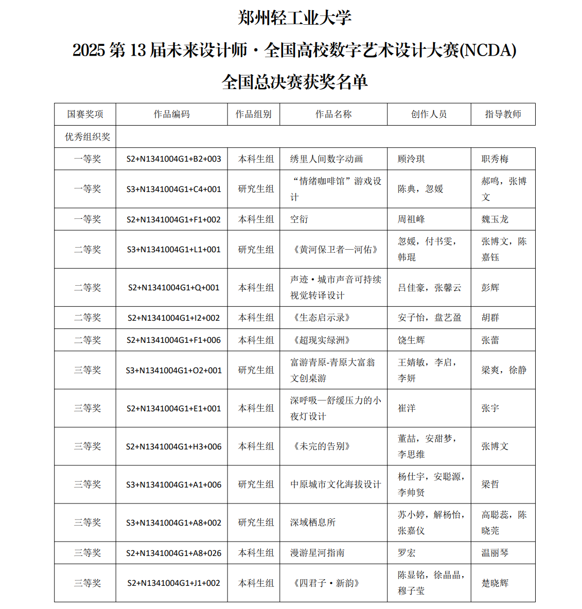 在已结束的2025年第13届未来设计师·全国高校数字艺术设计大赛(NCDA)全国总决赛中,艺术设计学院师生凭借扎实的专业素养和出色的创新表现,斩获佳绩,共获得国家级奖项14项,其中一等奖3项、二等奖4项、三等奖7项。在河南省省级赛中获得奖项85项,其中一等奖22项、二等奖33项、三等级30项。基于学院在赛事组织工作中的突出贡献,被大赛组委会授予“优秀组织奖”。
