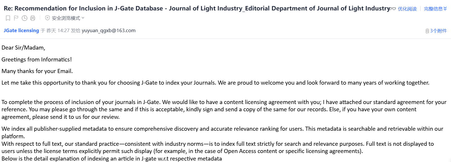 近日,《轻工学报》经过严格审核,正式被全球最大期刊平台J-Gate收录。这是本刊继入选DOAJ、EuroPub数据库之后的又一重大喜讯,既是对《轻工学报》学术质量与办刊水平的高度认可,也彰显了本刊在推进国际化进程中所迈出的坚实步伐。
