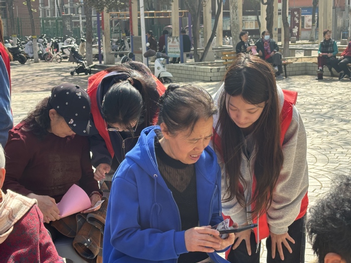 3月27日上午,数字科技与创意设计学院联合金水区志愿服务队在东风路轻院社区开展“数”你有爱·数字助老志愿服务活动,学院辅导员白婷、孔祥兰老师和20名志愿者前往,以热血践行雷锋精神,用行动传递青春温度。、