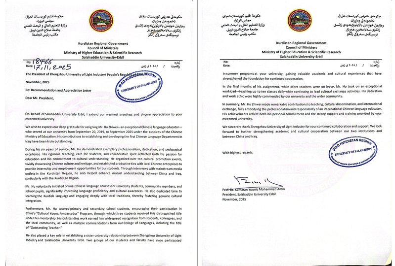 我校胡志伟老师获伊拉克萨拉赫丁大学高度赞誉