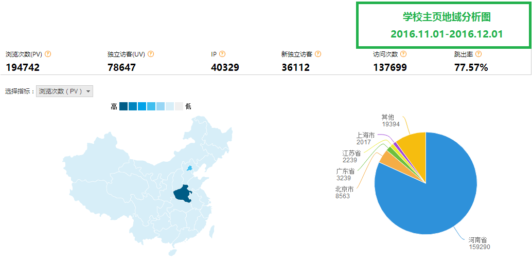 从上图可以看出访问我校主页的访客来源地域分析,河南、北京、广东排名前三,河南占比81.8%。
