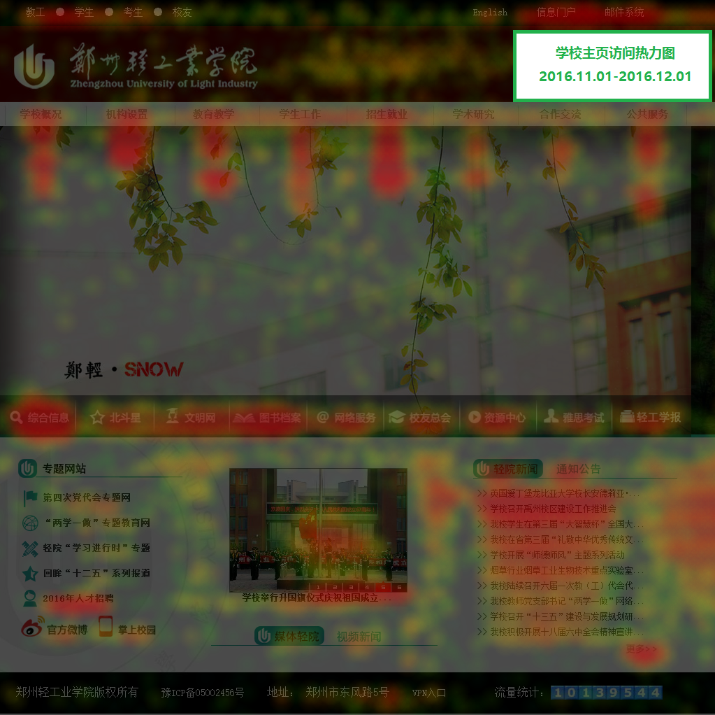 上图为综合信息网的页面点击热力图,从图中可以直观的看到网页的热点点击区域,和校园网用户关注的热点频道。