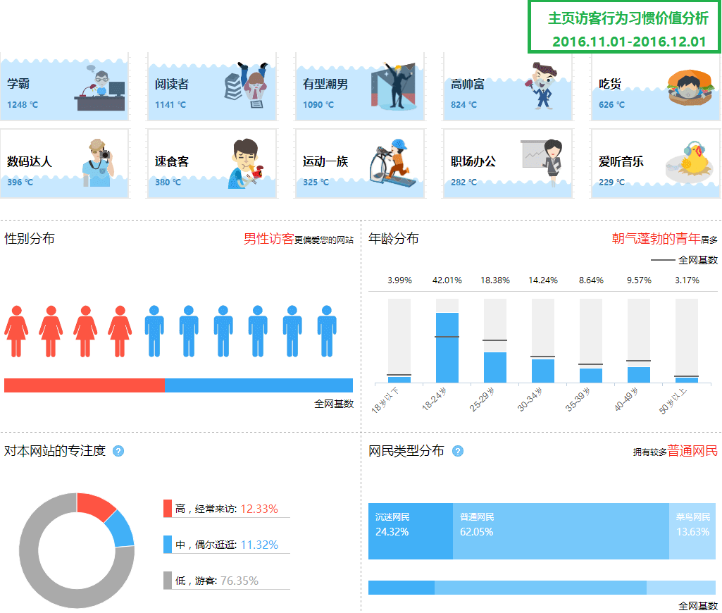 上图是我校主页访客的价值分析,从图中可以看出访问我校主页的用户的生活偏好,性别与年龄分布等各类信息。
