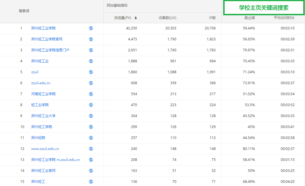 上图的数据可以看出学校的主页搜索关键字的排名状况,”郑州轻工业学院“搜索关键词排名第一.