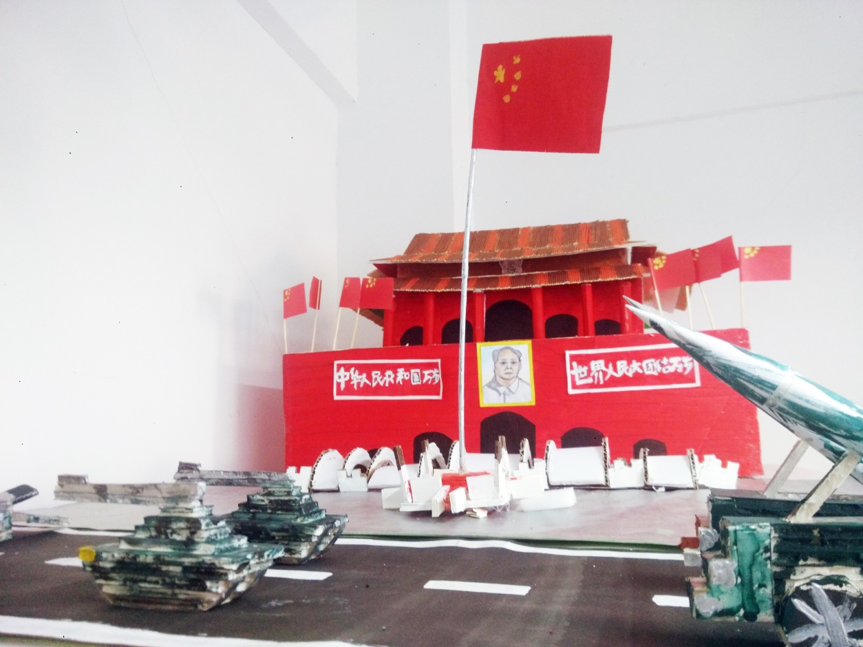 在晚会的最后,经济与管理学院学生会宣传部成员向观众介绍为本场晚会特别制作的手工艺品——天安门广场模型。该作品由宣传部搜索图片且构图,按照比例精确设计,广场前有宣传部成员做的坦克与飞机模型,当作品展示时,现场掌声雷动,将晚会再次推向高潮。大赛结束后,我院为获奖班级颁发了奖状,为杰出作品的个人颁发了证书和精美礼品,并合影留念。
