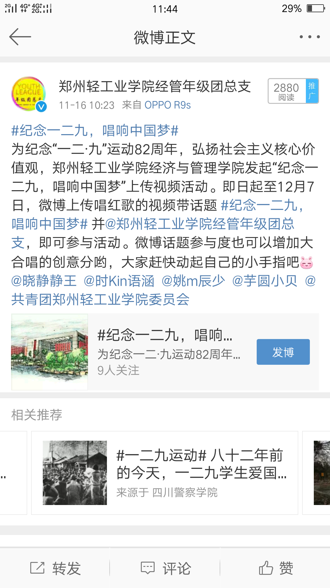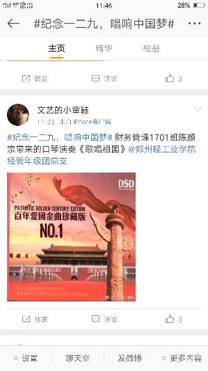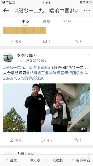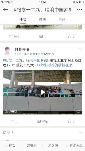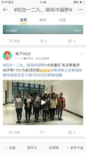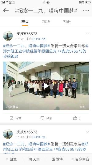 随着科技的发展,当代大学生对网络的依赖感增强,微信和微博成为了大家的交流窗口,为了让同学们铭记一二·九的历史,通过唱响红歌来表达自己的爱国情,经济与管理学院发起了“纪念一二九,唱响中国梦”上传视频活动。话题内容为上传自己唱红歌的视频发微博带话题#纪念一二九,唱响中国梦#并@郑州轻工业学院经管年级团总支,即可参与活动。活动开始后,同学们积极参与,上传唱红歌的视频,使同学们在娱乐休闲的同时对一二·九爱国运动有了更深的理解。