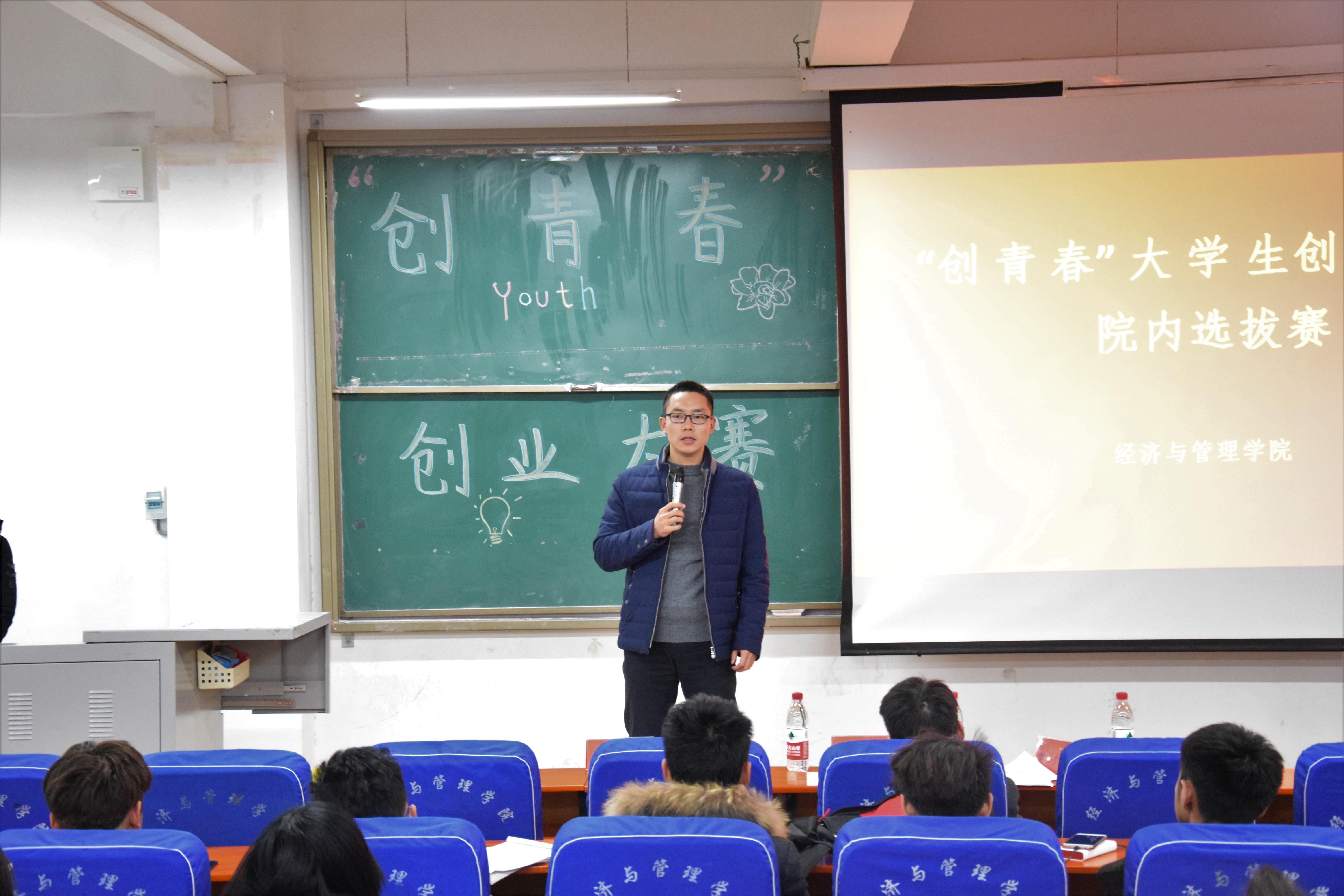 为深入学习贯彻党的十九大精神,学习习近平新时代中国特色社会主义思想,引导在校大学生树立创新意识、培养创新思维、弘扬创业精神,提高大学生就业竞争能力和创业能力,12月13日下午14:30,在经管楼211,经济与管理学院举办弘扬“十九大”• “创青春”创业大赛院内选拔赛。