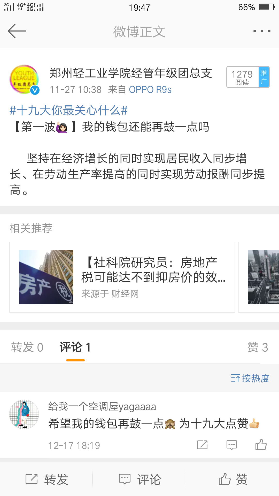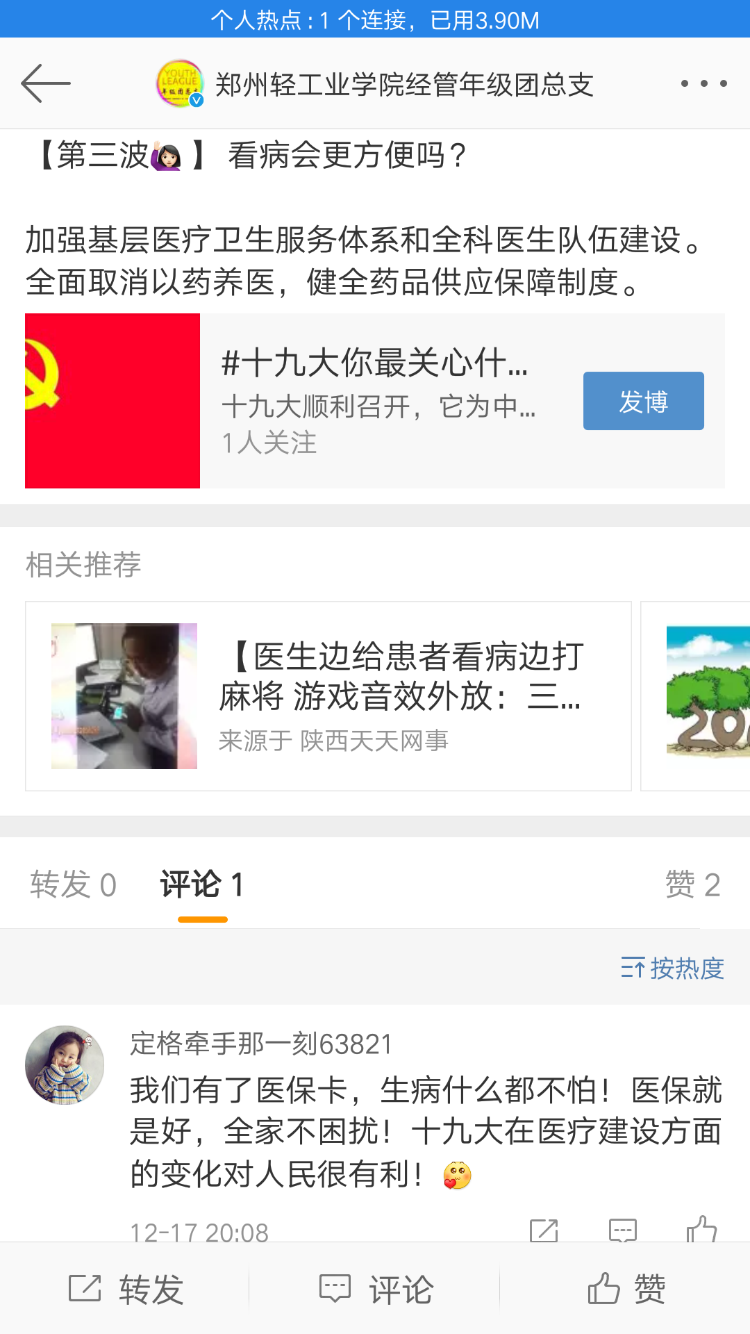 随着十九大的胜利召开,学习宣传党的十九大精神的热潮在院内迅速掀起,与此同时网络的快速发展和新媒体平台的建立与不断完善,微博微信成为了活动可依托平台。经济与管理学院为创新活动形式,让同学们更好的学习十九大精神,决定以微博话题的形式开展活动。活动内容为微博搜索话题#十九大你最关心什么#进入话题界面即可参与活动,在活动中主持人会即时为同学们回答一些“就业”“公平正义”等生活中与同学们息息相关的问题。活动开始后,同学们积极的参与互动,学习十九大的精神,使同学们在网络浏览的同时对十九大内容有了更深的理解。